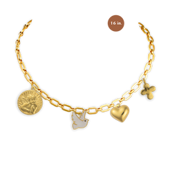 A celestial stack on a beautiful Delicate 16 inches Gold Chain; this bundle includes the classic Gold Heart, the protective Gold Angel, a beautiful Pendant (for a touch of grace), the timeless Gold Cross, and the gentle Gold Dove of peace. Wear your truth.