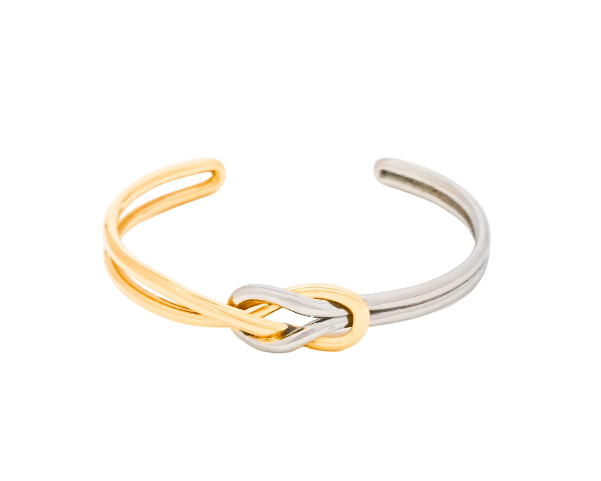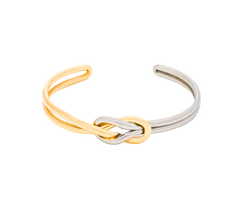 This sleek bracelet features two distinct bands—one highly polished gold-tone and one silver-tone—that gracefully intertwine at the center to form an elegant knot. The mixed-metal design offers a contemporary aesthetic that pairs effortlessly with existing jewelry in either finish, making it a versatile staple for everyday wear or special occasions.