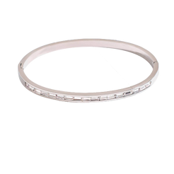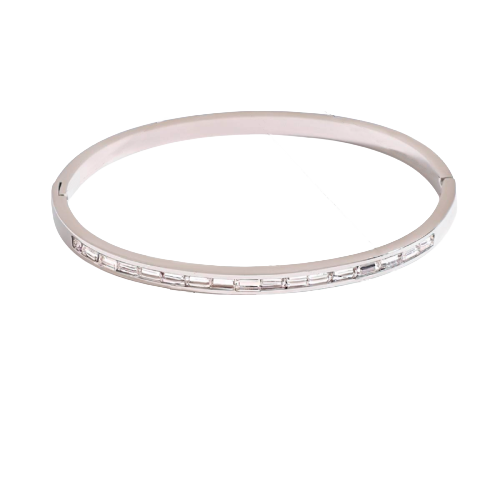 This sleek, silver-tone bracelet features a continuous row of meticulously channel-set baguette crystals that shimmer with every movement. Its streamlined silhouette and contemporary design offer a high-fashion aesthetic that pairs effortlessly with a minimalist watch or other bracelets, making it a versatile staple for everyday luxury or sophisticated evening wear.