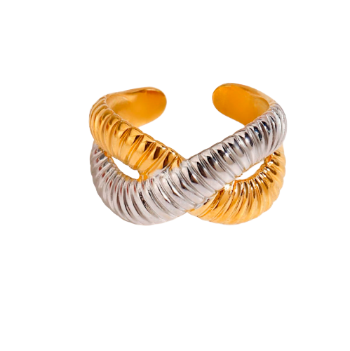 This ring features two distinct, ribbed bands—one radiant gold-tone and one polished silver-tone—that gracefully cross over one another to form an elegant interlocking knot design. The mixed-metal, "croissant" textured finish offers a contemporary aesthetic that pairs effortlessly with existing jewelry in either finish, making it a versatile staple for everyday wear or special occasions.