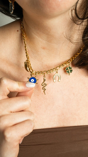 You don’t wait for luck; you attract it. Manifesting good vibes and protection, this talisman is for the girl who believes the universe is always on her side. This fortune-filled collection gleams on a delicate 16-inch gold chain. The stack includes the fierce Bengal Tooth (for strength), the watchful Protective Eye (guiding your way), the wise Gold Snake, a classic Gold Horseshoe (good fortune), and the rare Four-Leaf Clover (one in a million).