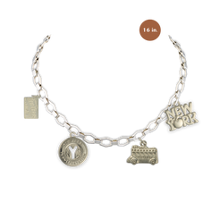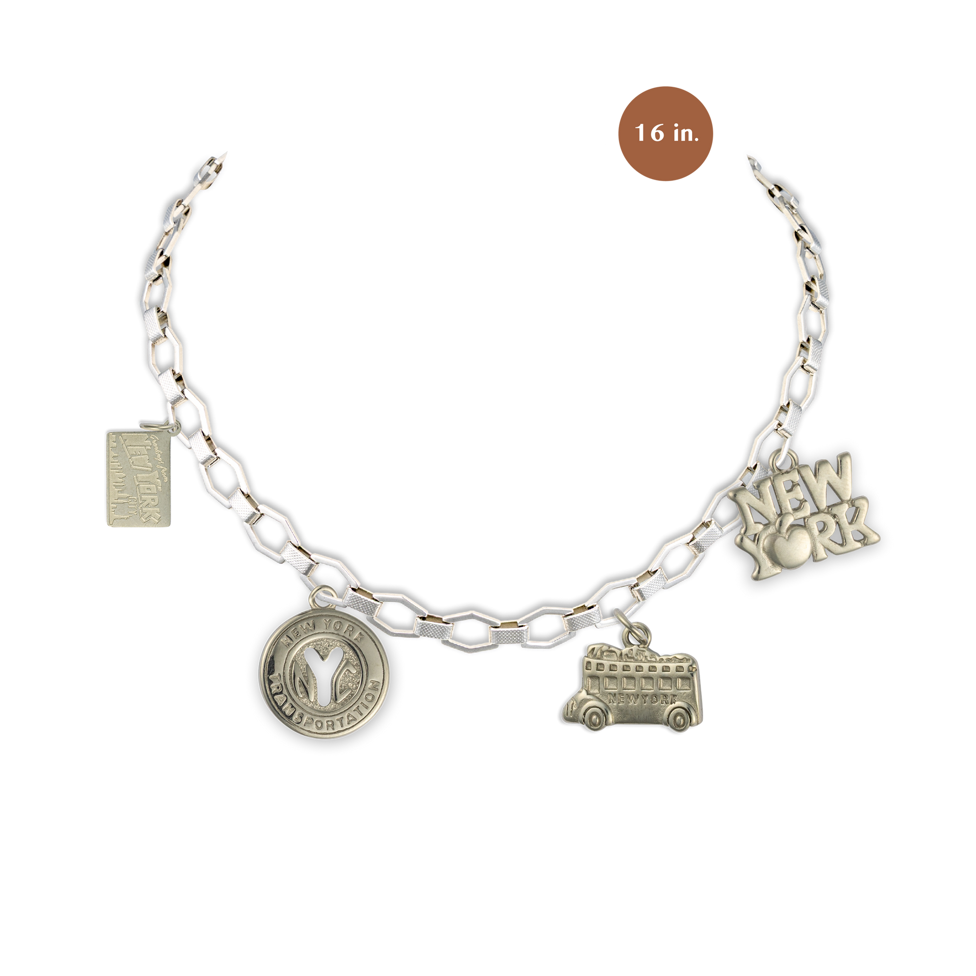 All the grit and grace of NYC in polished silver on a delicate 16 inches Silver chain. Featuring the classic Silver New York city stamp, Silver NY Transportation (because we’re always moving), the Silver NY Tour Bus, and the collectible Silver NY Postcard.